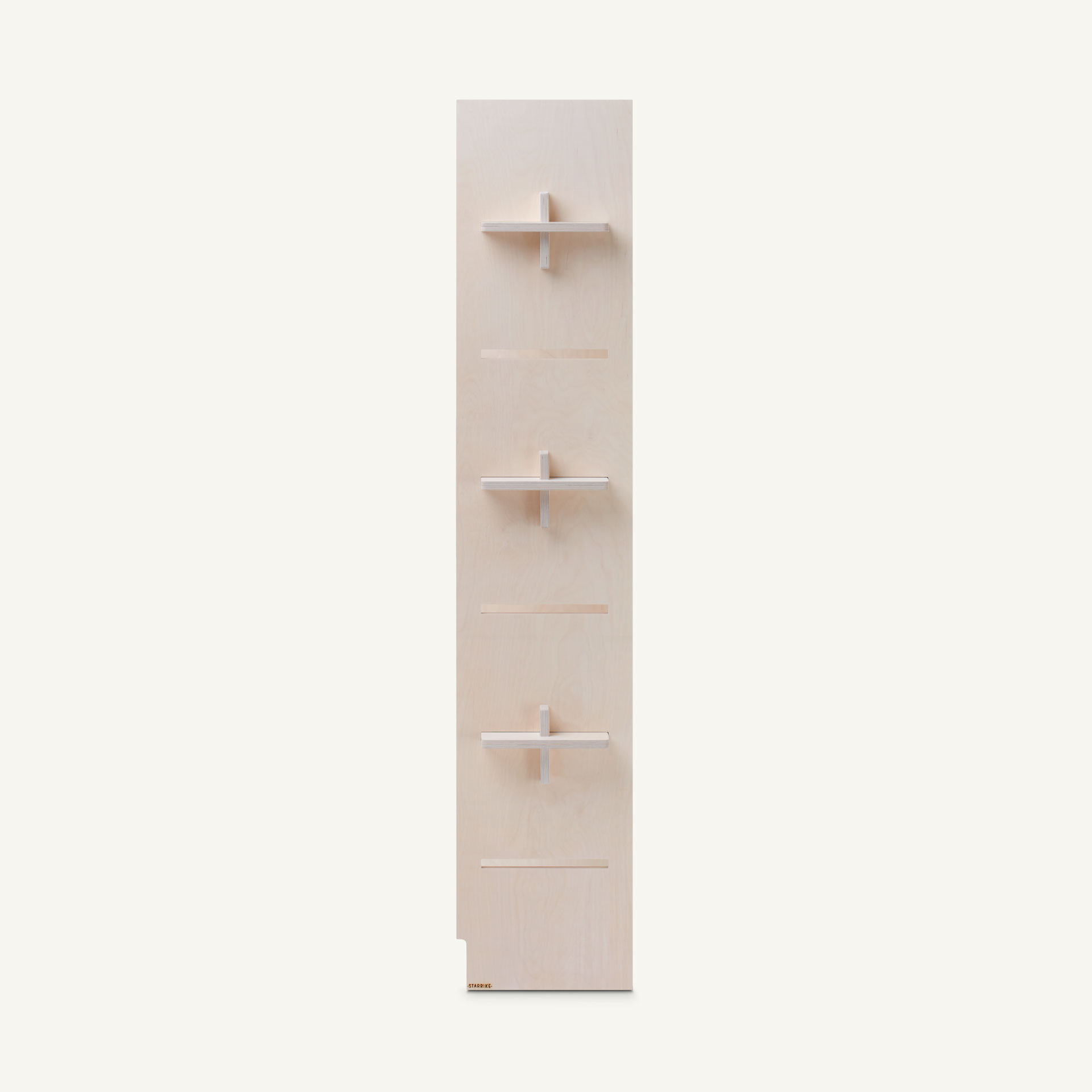 Hyllan Kil är tillverkad i 18 mm Kryssfanér av björk som har ytbehandlats med en vitpigmenterad klarlack, vilket ger produkten en vacker, ljus, yta och ett bra skydd. Dessutom blir den enkel att rengöra. Grundsektionen i vårt startkit består av två stycken 1750 mm höga gavlar, tre stycken hyllplan och kilar för montering. Kilarna låser hyllorna i gavlarna och ger stabilitet. Fungerar lika bra mot väggen som rumsavdelare. Hyllan förankras mot vägg med det medföljande tipp-skyddet. Se spännande byggförslag under montering nedan. Varför inte välja till extrahyllor eller en skrivbordsskiva med behaglig linoleumyta för flexibel användning. Leveranstid: 2-5 arbetsdagar.