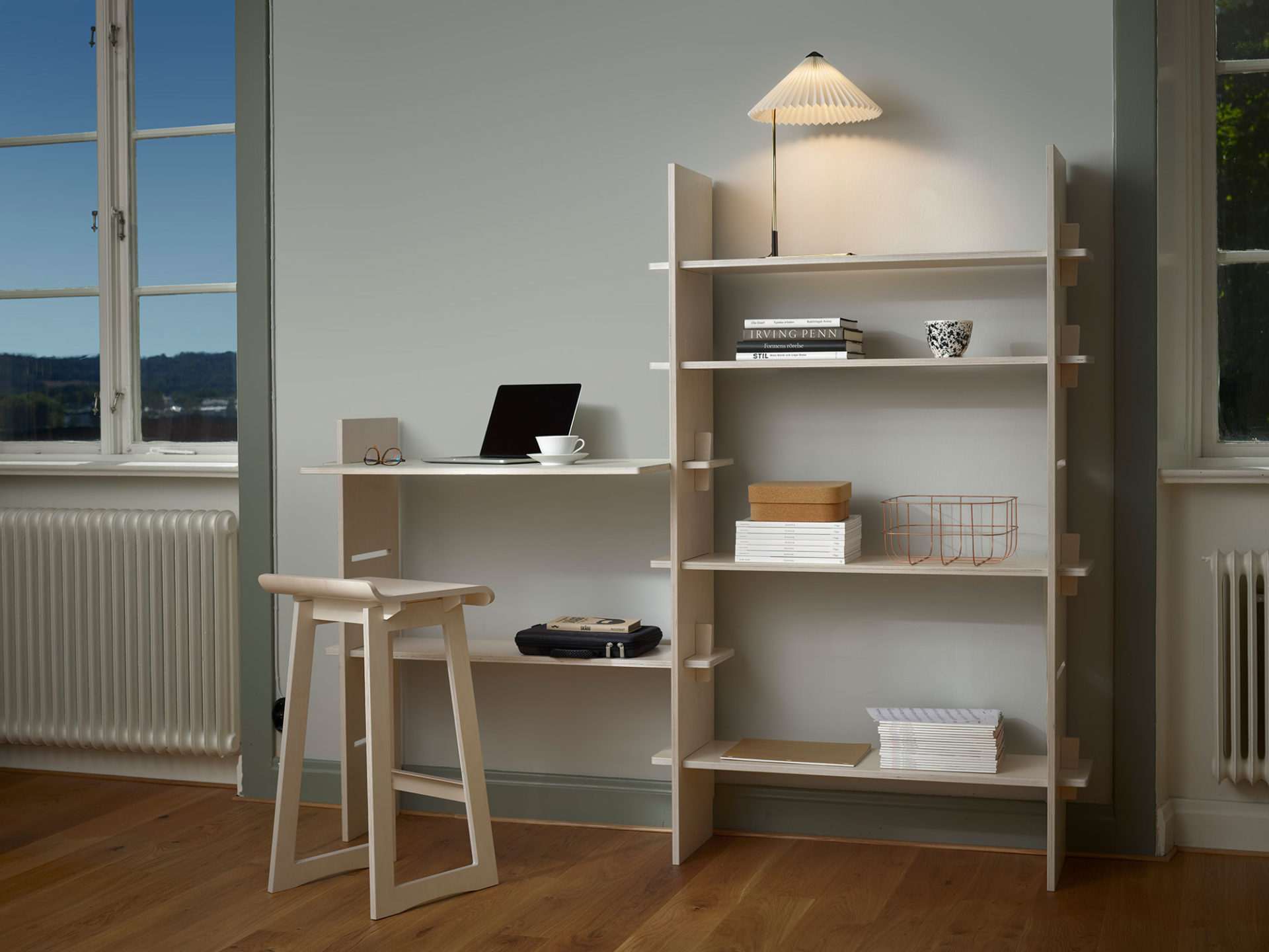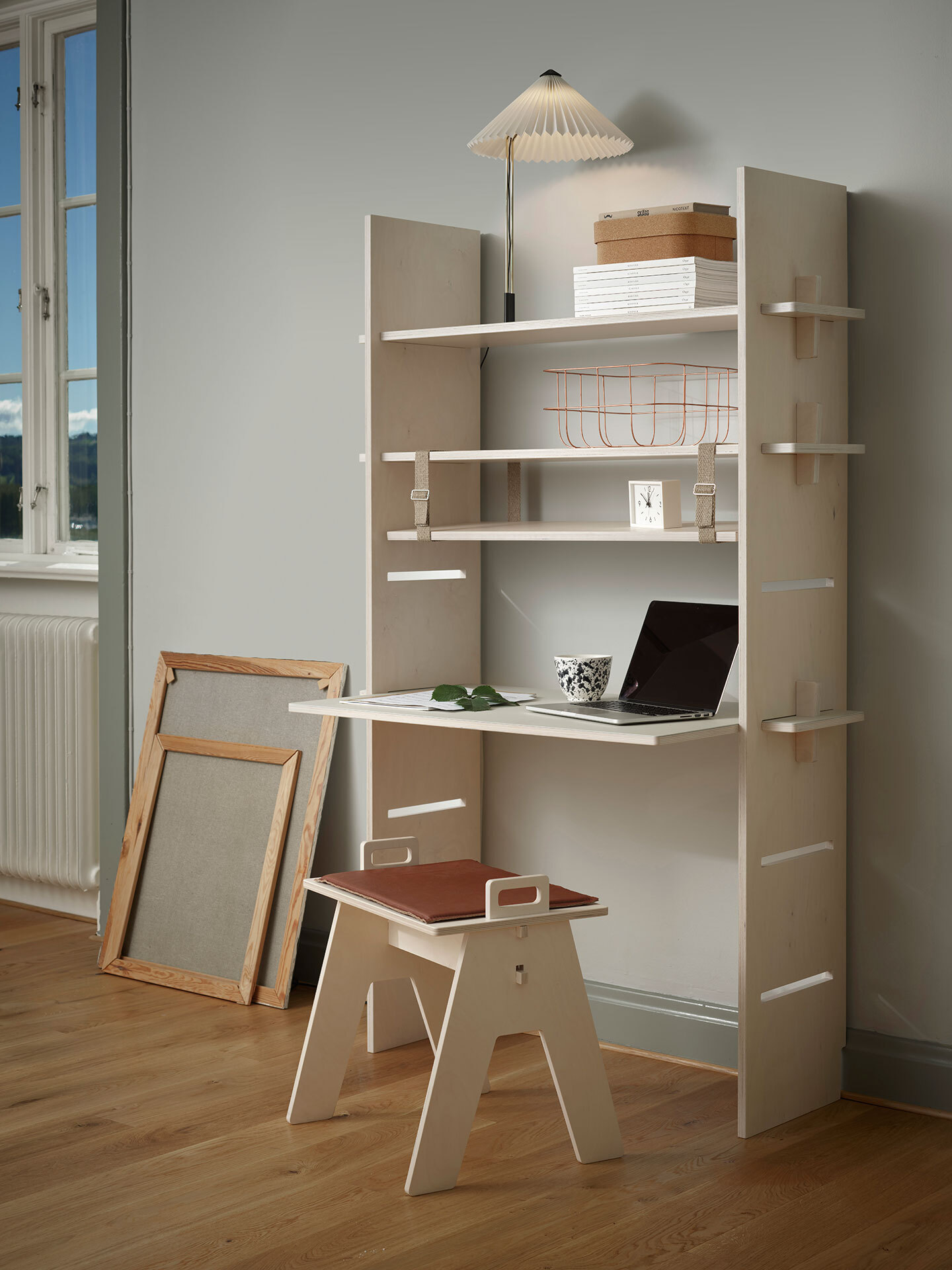 Tänk att göra en hylla helt utan skruvar och beslag? En hylla som kan byggas om och med olika användningsområden. Som kan växa och byta form efter livets behov. Går det? Där har vi starten för arbetet med hylla Kil – som blev en hylla mot väggen, eller varför inte en rumsavdelare. Snart föddes iden om att en hylla borde kunna bytas ut mot en skrivbordsskiva.