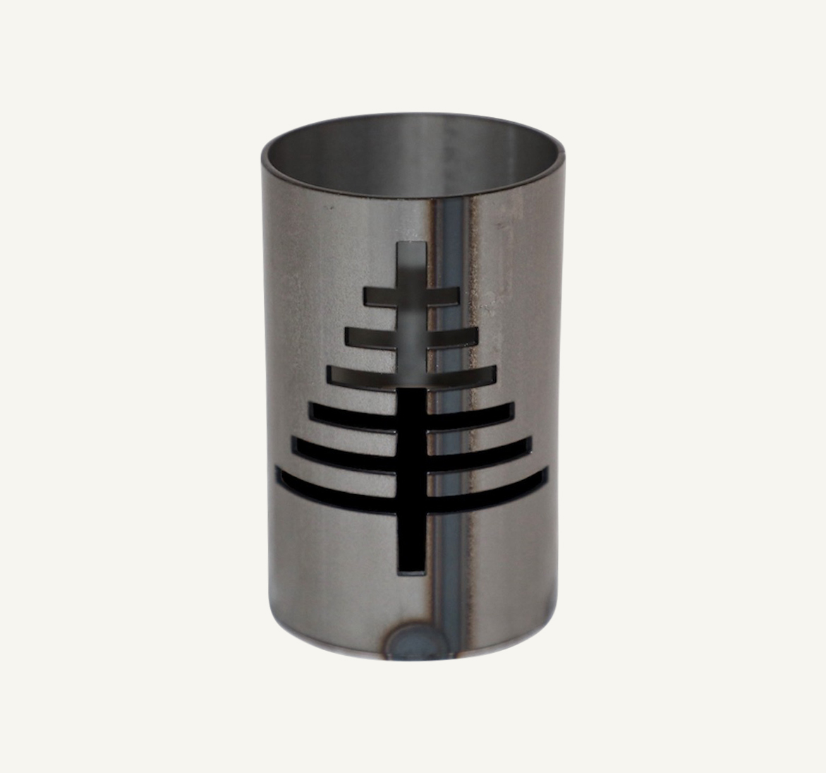 Ljuslykta, för stämningens skull. Med laserskurna streck som likt grenar på ett träd släpper igenom ljust. Gjord i klarlackat stål.