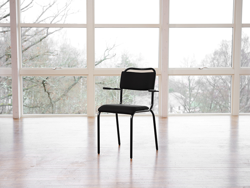 Stabil stol med armstöd. Välj sits och rygg i trä eller klädsel. Standardfärg är svart eller silver på rörstommen. Men eftersom vi har all tillverkning kan vi skräddarsy stolar för dig med andra tyger och färger.